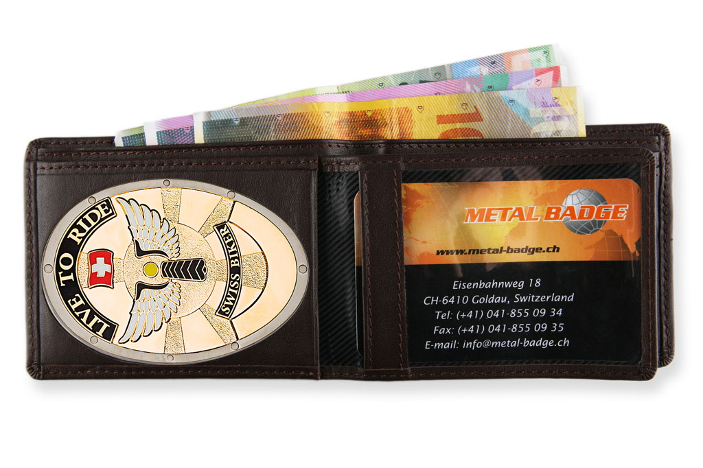 Brown leather wallet with window for identification, credit card compartments, coin pocket, and banknote compartment.