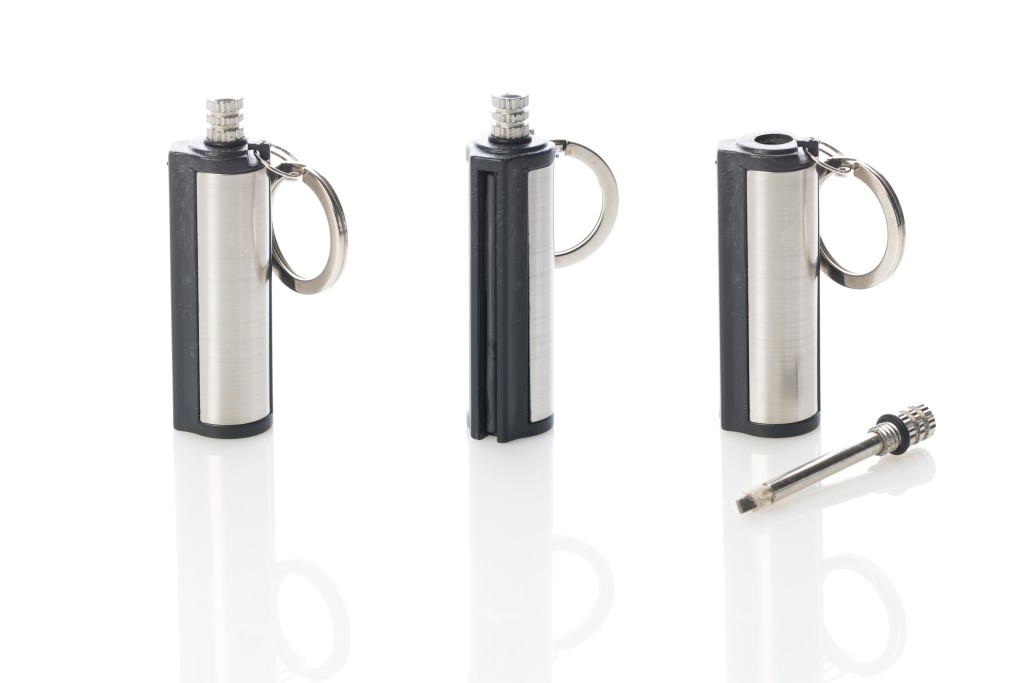 A cotton stick soaked in gasoline gets ignited by a fire stone. Just like on a box of matchsticks, the metal stick gets rubbed along the fire stone after which the cotton head ignites and you have a flame on the pin head. Easy but effective function. The container is always delivered empty (dangerous goods). It can easily be filled with lighter fluid (gasoline).