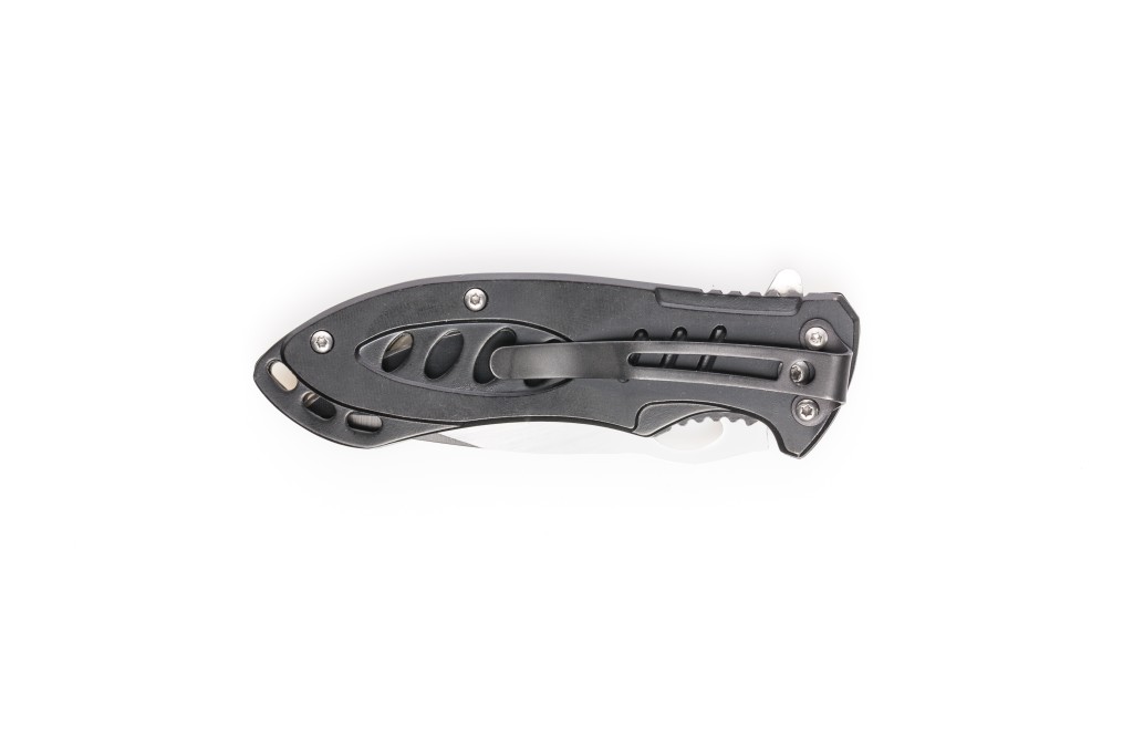This pocket knife in camouflage colors is ideal for hunters and outdoor. It can easily be attached to your belt with a clip. The frame lock latch can be released by pressing the lower handle.