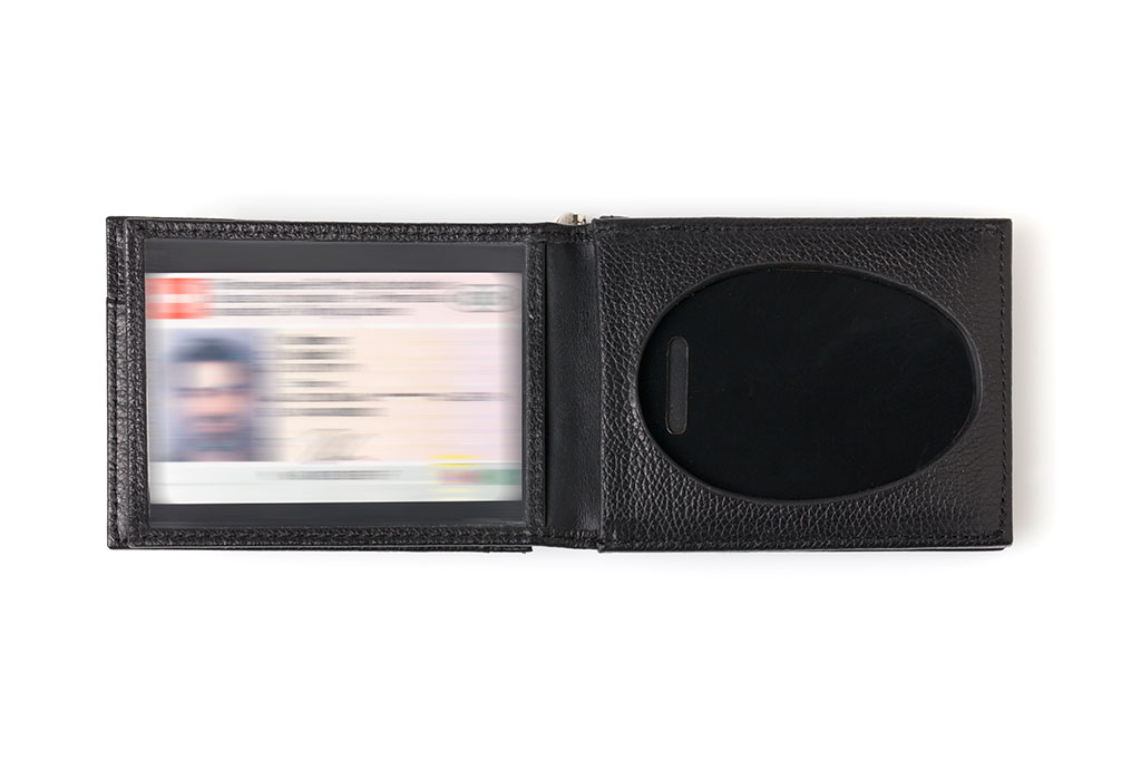 Black trendy cowhide leather wallet with two windows for ID cards. The wallet has three folding sides with pushbutton provided for min. 24 Credit cards. The bank notes, notes can easily be clamped with a metal bracket in the wallet. The badge can be concealed inside, as well as visibly carried outer side in this wallet..Â