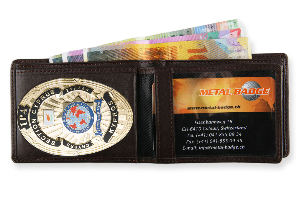 Brown leather wallet with window for identification, credit card compartments, coin pocket, and banknote compartment.