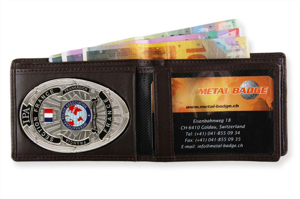 Etui en cuir marron avec fenêtre pour carte de crédit, compartiments pour cartes de crédit, monnaie et billets.