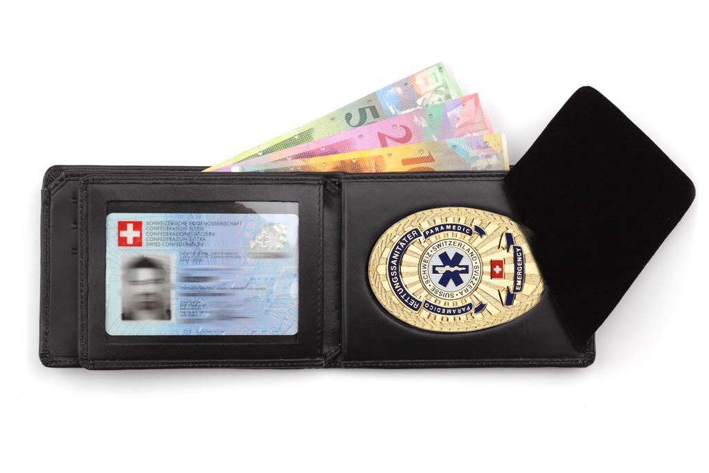 Etui en cuir noir pratique de haute qualité avec une fenêtre pour carte d’identité, six emplacements pour cartes de crédit et deux compartiments séparés pour les billets de banque. Dimensions: largeur 12 cm / hauteur 9 cm.