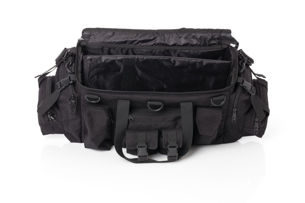 Sac d’intervention solide et hydrofuge, spécialement pour la police et les forces de sécurité. Ce sac fonctionnel avec fermeture-éclair à double tirette est équipé d’un rembourrage intérieur. Dans le sac spacieux, il y a de la place pour tout l’équipement, de la matraque en passant par la lampe et jusqu’aux menottes. Les 2 x parois intérieures divisent 3 x compartiments et peuvent être retirés avec une bande autogrippante pour transformer le sac en un grand compartiment. Fond amovible. Sur le couvercle à l’intérieur, il y a 3 x poches intérieures avec fermeture-éclair et bande autogrippante pour le petit matériel et 1 mousqueton pour les clés.
