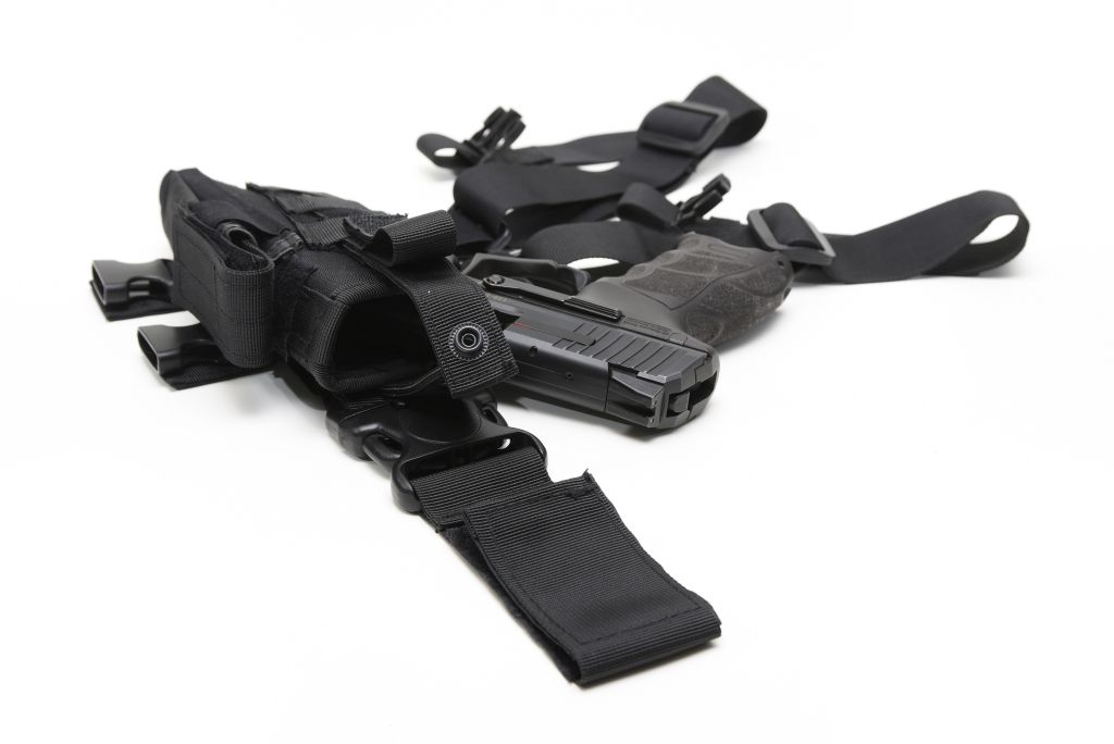 Étui profond pour toutes les armes courtes courantes. Sangles de hanche, de cuisse et fixation de ceinture toutes réglables et amovibles à l’aide d’une fermeture à cliquet. Étui à passant de ceinture avec velcro (pour ceintures jusqu’à env. 5 cm) adaptable individuellement par sangle de sécurité à fermeture velcro, avec velcro et bouton pression. Une poche pour lampe-torche ou chargeur se trouve à l’avant.