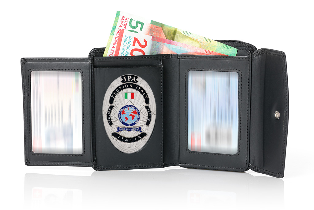 Questo portafoglio robusto in pelle nera bovina di elevata qualità soddisfa ogni richiesta. Esternamente il portafoglio ha una doppia tasca per le monete ed è dotato di una cerniera perimetrale, sulla parte posteriore si trova una zona in cui riporre le banconote. Il portafoglio in formato verticale può essere aperto grazie ad un bottone automatico posto sulla parte anteriore. All’interno si trovano sia a destra che a sinistra delle finestrelle per ID / documenti di identità . Al centro vi è un supporto con apertura per il badge ed un sotto scomparto per appunti o carte di credito. Inoltre ci sono altri 3 scomparti per carte di credito per almeno 6 carte posti sulla parte posteriore della finestrella per ID / documenti di identità . Â