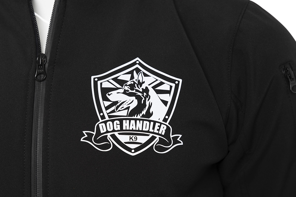 Klassisch-Sportlich geschnittene schwarze Softshell-Jacke mit Aufdruck «Dog Handler K9 mit Logo» an Rücken, Ärmel rechts und Brust links. Der Aufdruck ist reflektierend, somit wird der Träger auch bei schlechter Sicht oder in der Nacht gut wahrgenommen. Unsere hochwertige Membran ist winddicht, wasserdicht bis 4.000 mm und äußerst atmungsaktiv. Damit hält Sie unsere Softshell-Jacke schön trocken und warm. Die Reissverschlüsse sind wasserdicht und erweitern den Einsatzbereich dieser Funktionsjacke. Die Jacke ist mit zwei grosszügigen Reissverschluss-Seitentaschen und einer Ärmeltasche links ausgestattet. Armabschlüsse, Kragen und Bund sind aus elastisch weichem Polyester-Material gefertigt.