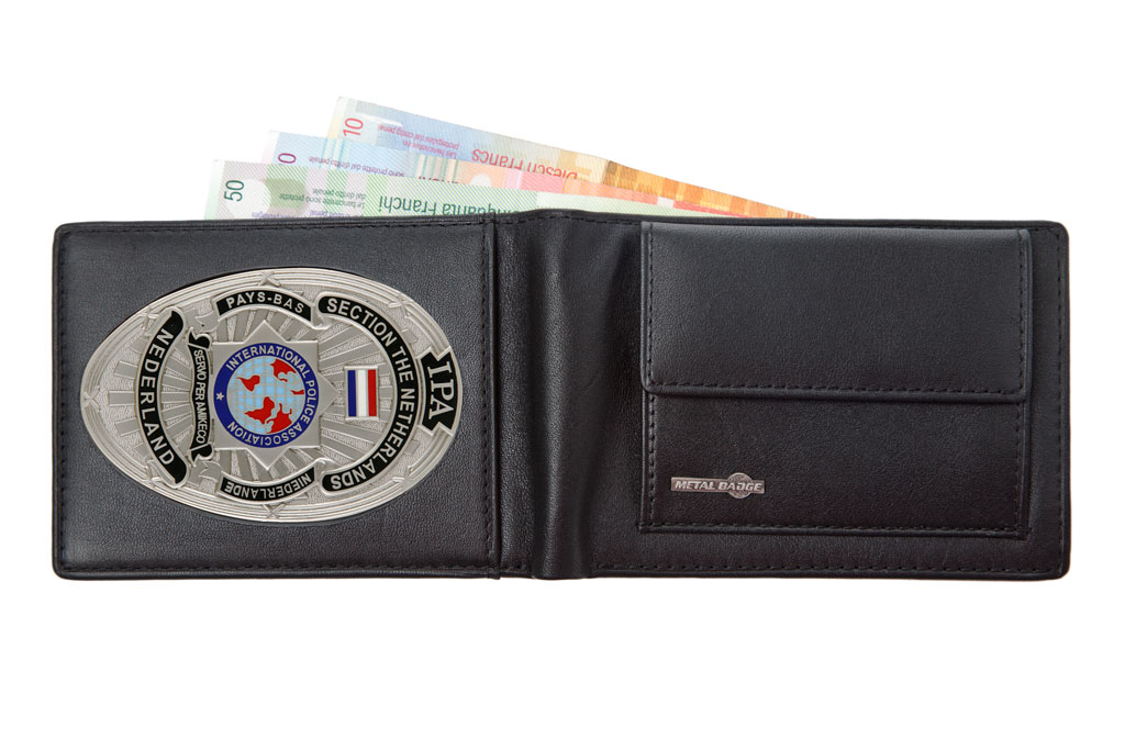 Aufklappbares schwarzes Rindsleder-Etui im handlichen Format. Münzfach mit Druckverschluss und Badge sind bei diesem Etui auf der Aussenseite angebracht. Sichtfenster für Ausweis sowie ein zusätzliches Fach für 6 bis 7 Kreditkarten. Ebenfalls im Etui enthalten ist ein Notenfach. Masse: Breite 10.5 cm / Höhe 7.5 cm.